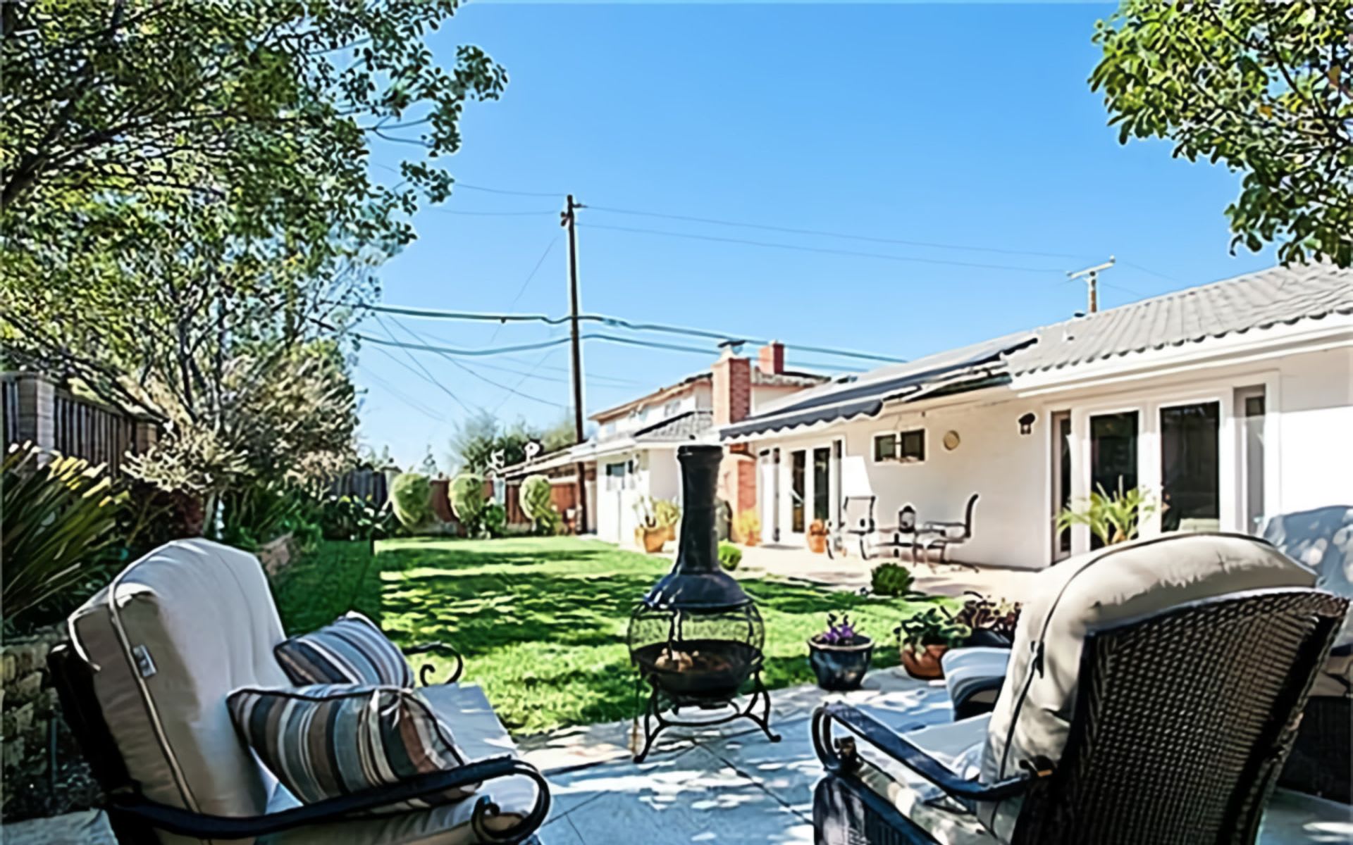 Do you like privacy in the backyard? Look no further, this backyard is awesome. There are a couple distinct patio areas to the left side of the backyard, one of which is perfect for enjoying conversation on a cool Costa Mesa night. The backyard also features a retractable awning which helps create shade in the summer, but tucks away when not in use. The patios feature large, rustic stone which is fairly uncommon in Costa Mesa.
